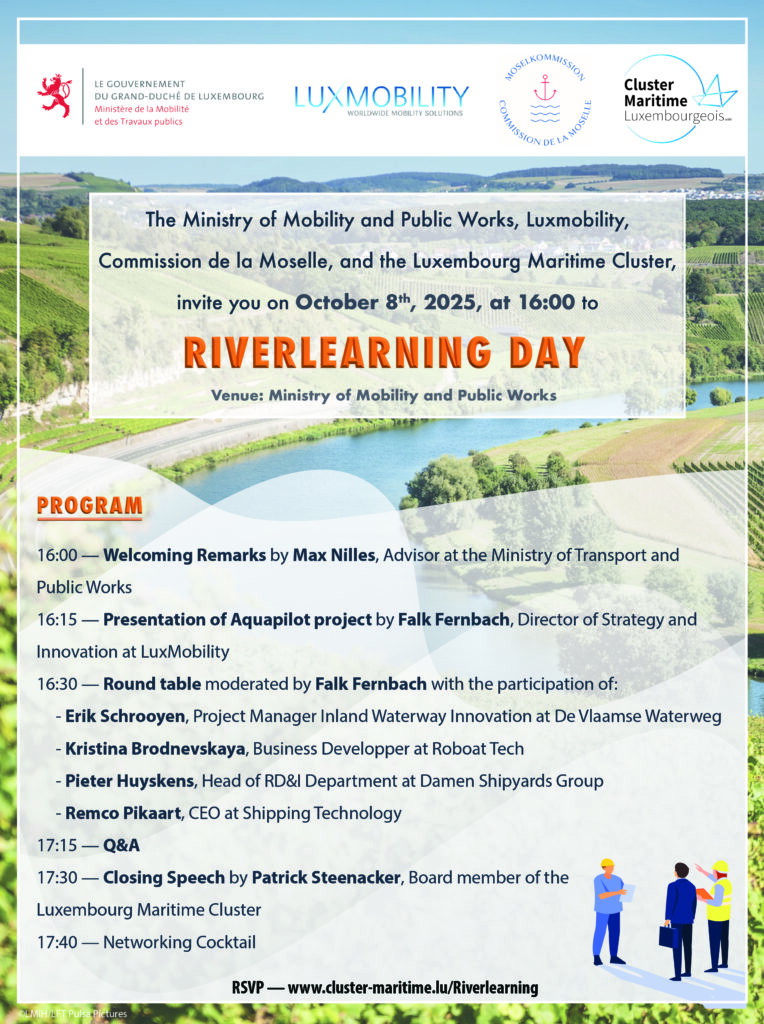 The Ministry of Mobility and Public Works, Luxmobility, Commission de la Moselle, and the Luxembourg Maritime Cluster, invite you to a dynamic and interactive session focused on innovation in the inland navigation sector.